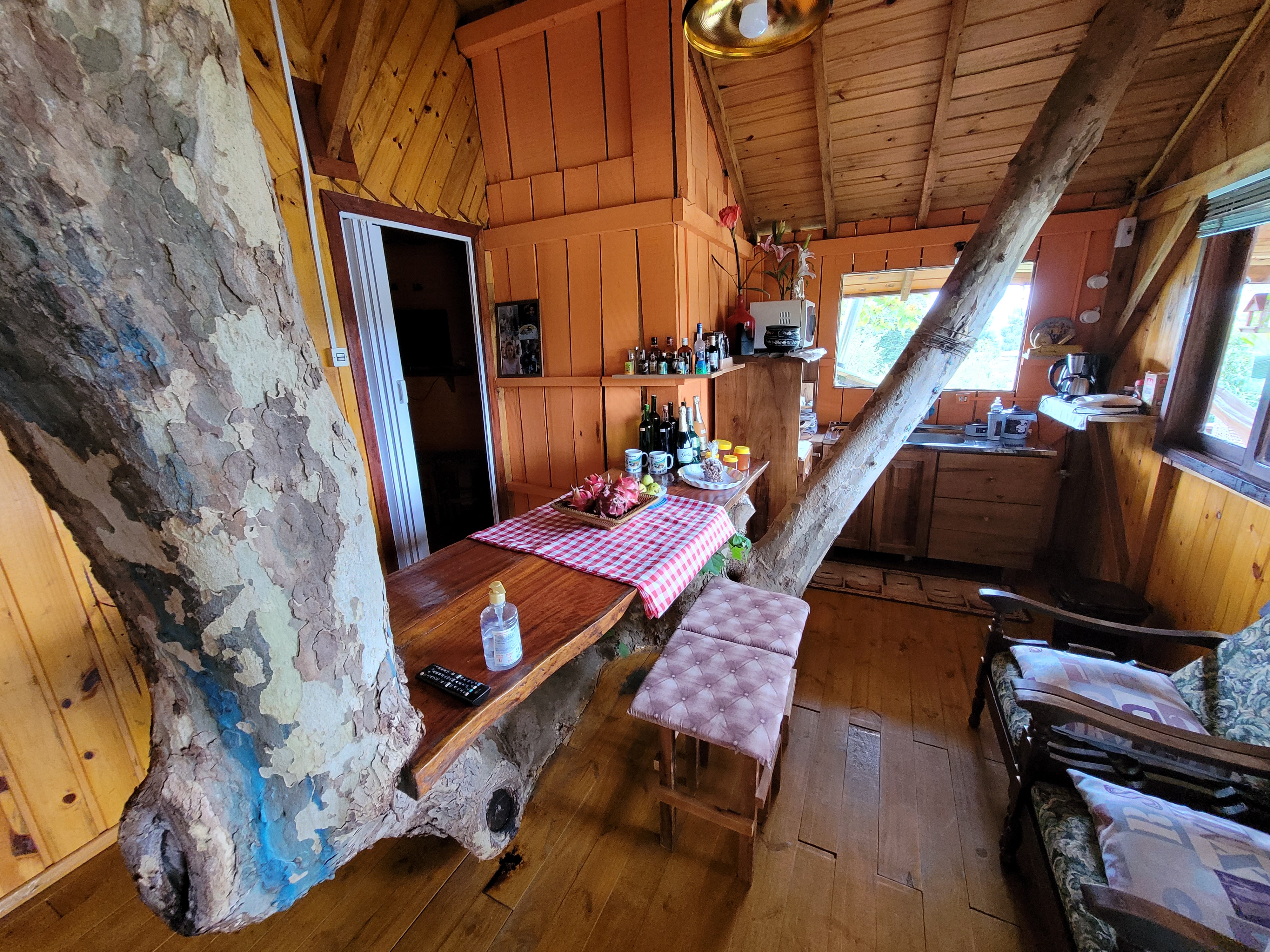A casas da arvore – Acomoda até 3(três) pessoas, equipada com uma cozinha completa, uma cama de casal, uma cama solteiro, ar-condicionado, TV a Cabo (Sky e Netflix).